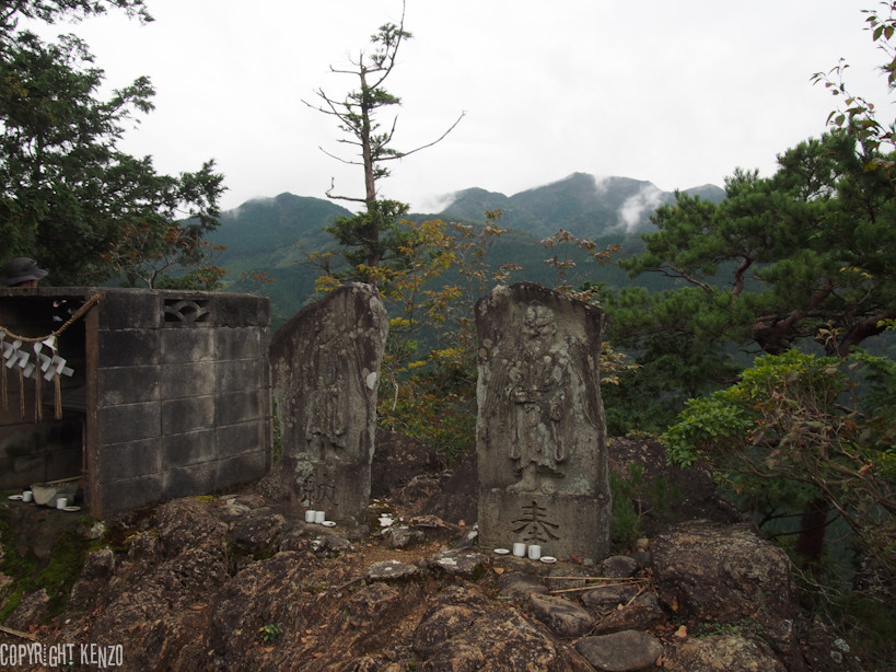 天狗の石像とその向こうに見えるのは川苔山(多分)